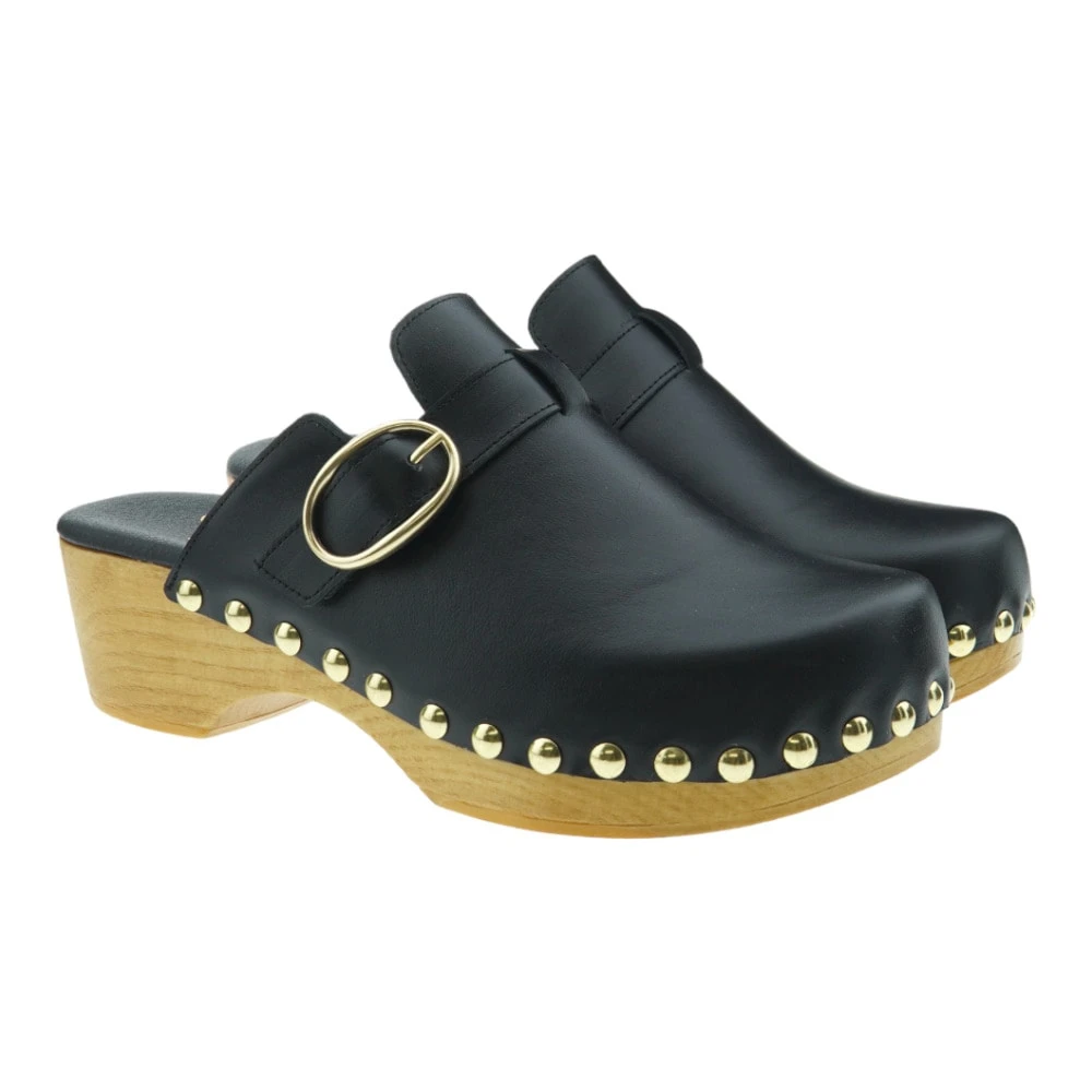 Los clásicos zuecos de madera vuelven este verano con tacón bajo. Estos zuecos están fabricados en piel, con tachuelas alrededor del piso y con adorno de una hebilla en el empeine. El interior es de piel y el tacón bajo.
