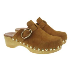 Disponible en diferentes colores, piel de serraje cuero y kaki. Consejos de talla: Calzan el número. Estos zuecos los empezaremos a llevar en primavera ya que van cerrados por delante y los combinaremos con unos jeans o con vestidos y faldas.